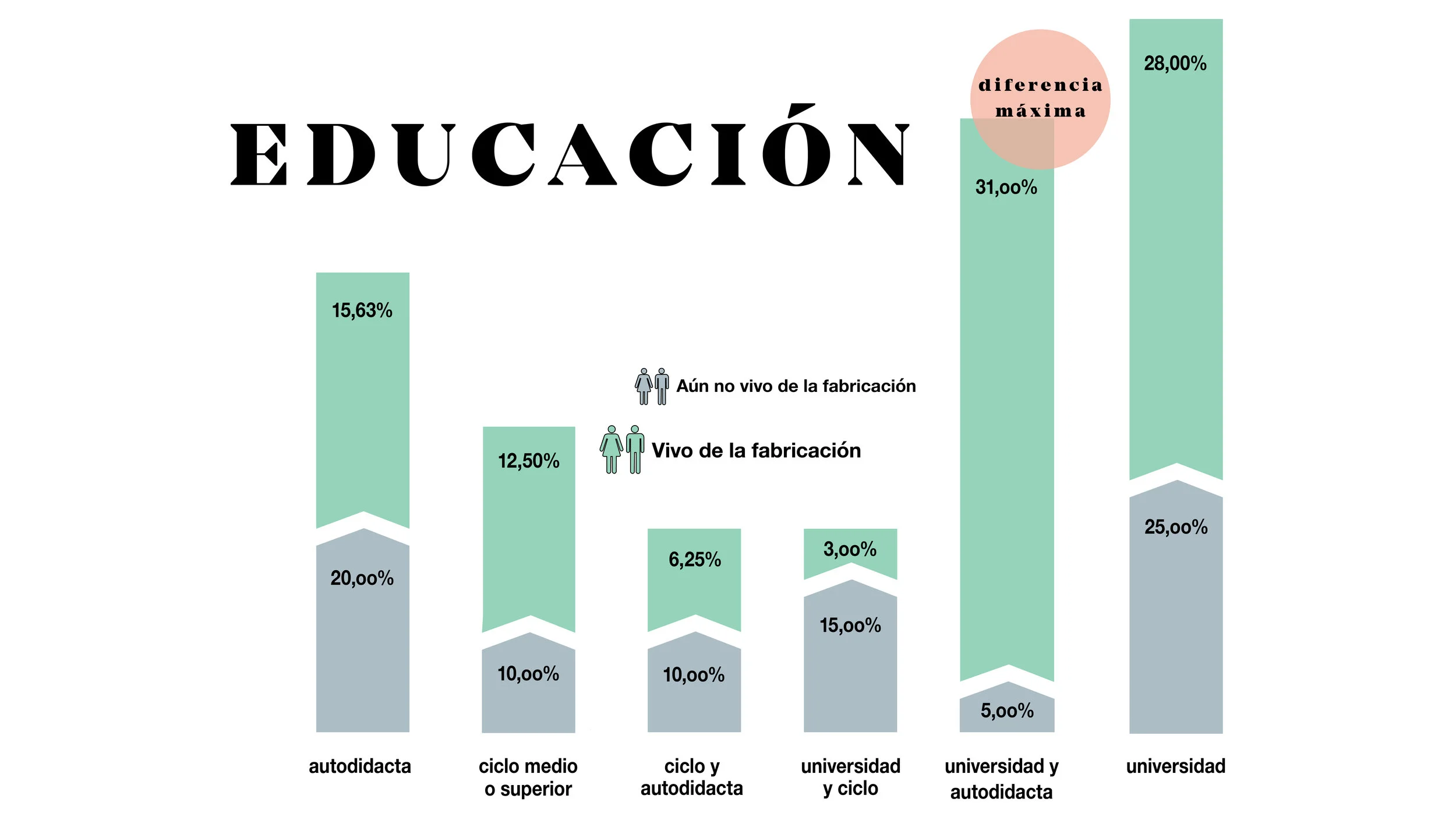 En nuestra investigación hemos visto que hay un punto muy interesante que parece ser un ingrediente de gran importancia en el momento de tener éxito en el mundo del diseño y de la autoproducción: la combinación de estudios universitarios y la parte autodidacta. Lamentablemente no hemos podido descubrir el porque de este resultado, pero parece ser una combinación que ayude en llegar a vivir de la fabricación.